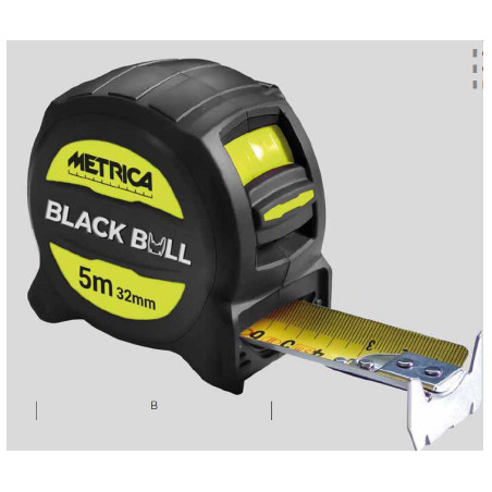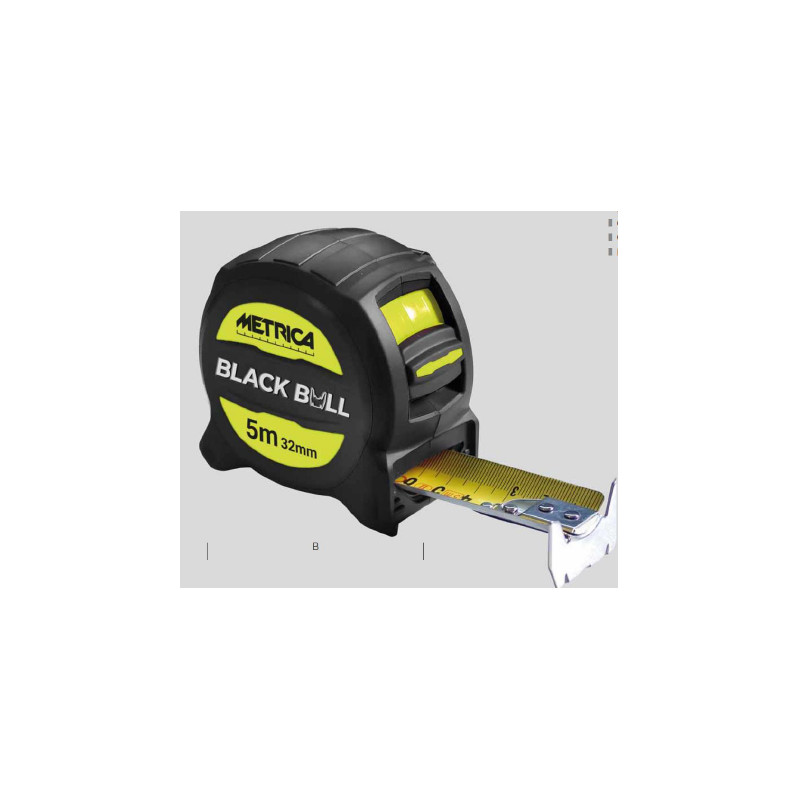 Le mètre ruban METRICA BLACK BULL, référence 08075, dispose d'un ruban de 5m de long et 32mm de large avec une finition texturée. Il offre une double graduation pour une lecture aisée et un crochet à double prise avec aimant pour une extension stable de plus de 4 mètres.